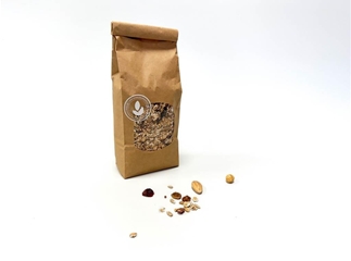 Heerlijke eigen gebrande muesli zonder toegevoegde suikers met onder andere speltvlokken, hazelnoten, amandelen, gedroogde cranberries, rozijnen en abrikozen. Per 400 gram.