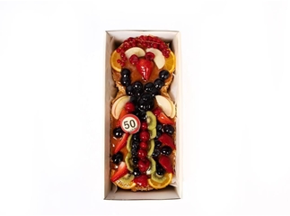 Yes, sara of abraham gezien! Dat mag gevierd worden. Bijvoorbeeld met deze vruchtentaart in de vorm van sara of abraham.Verpakt in een mooie kadoverpakking. Afmeting 40cm x 18.5 cm
